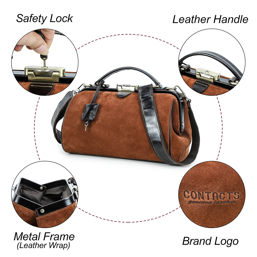 2026 Retro Brown Suede Lady Doctor’s Bag Anti-Theft Crossbody Handbag Top Lock Genuine Leather